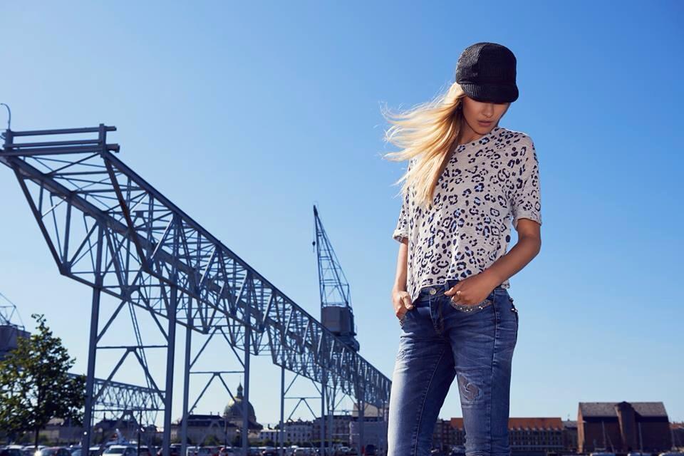 Outfit fra Piezsak, jeans med paljetter og topp med dyreprint.